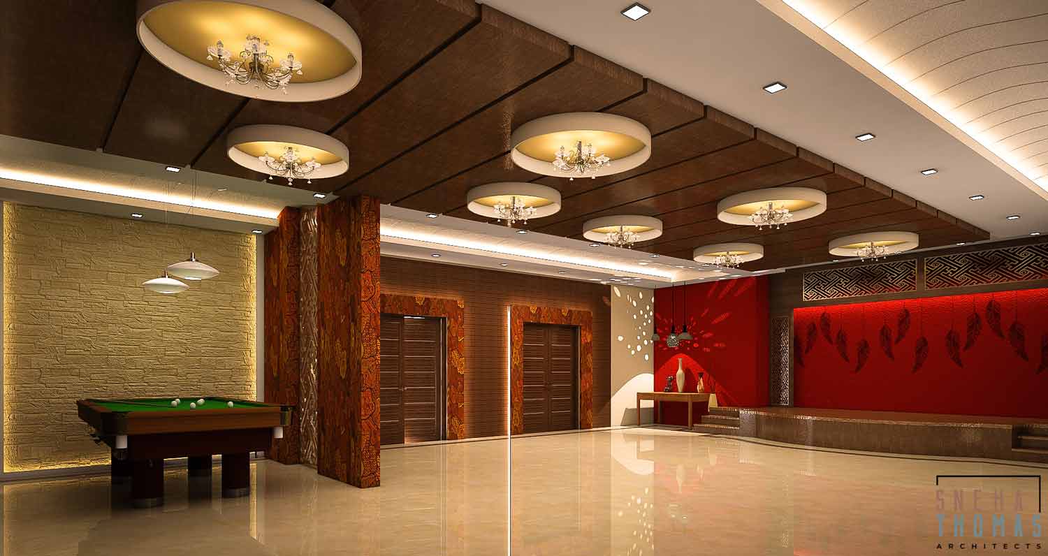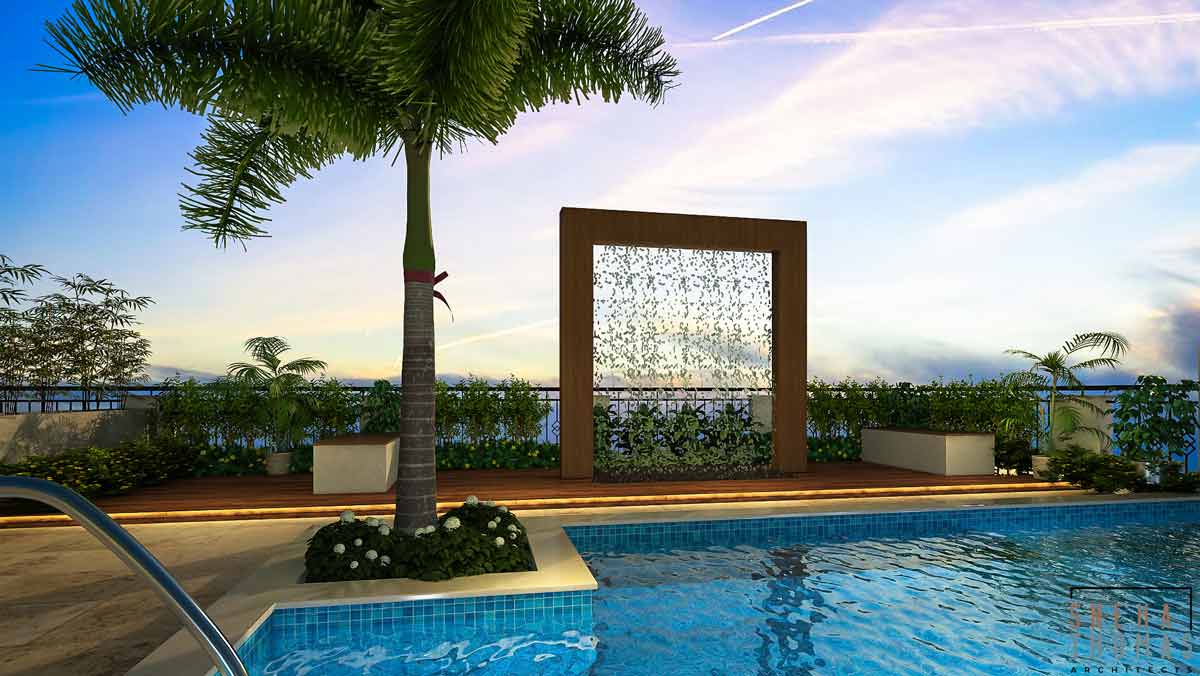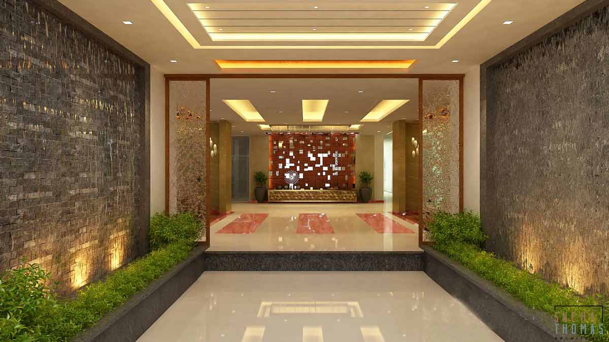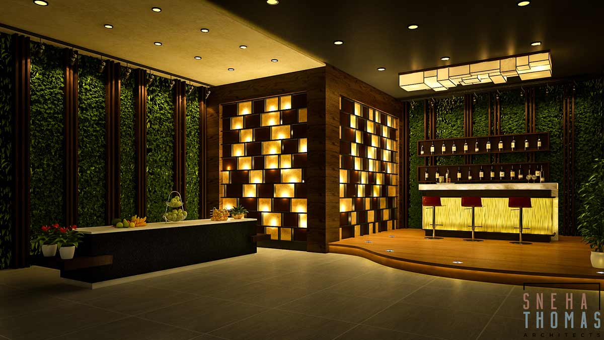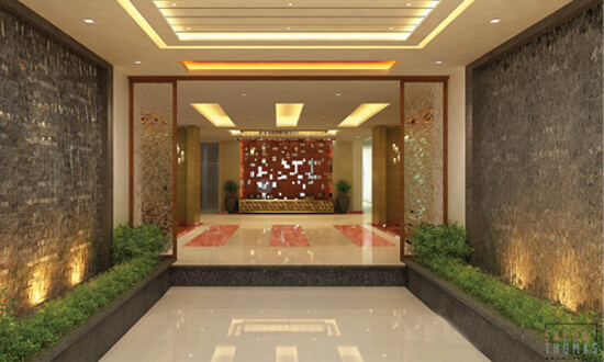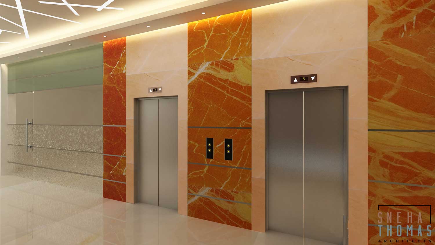 Designing the common areas of an Apartment is not quite same as designing for a specific client. The aesthetics have to have a universal appeal and strike a chord with the dwellers, while not being definitive. Lobby spaces of the Entrance, Lift, Common Amenities, Club House were given significant design features. The entrance was along Water Feature wall leading to a geometric mural with traditional Terracotta tiles and Bronze Mirror pieces. Our objective was to give the building identity and appeal encouraging a community spirit and social cohesion. The communal spaces were designed to feel fresh and exciting to create a social environment. Lighting was attributed to a pivotal role in each designed space.