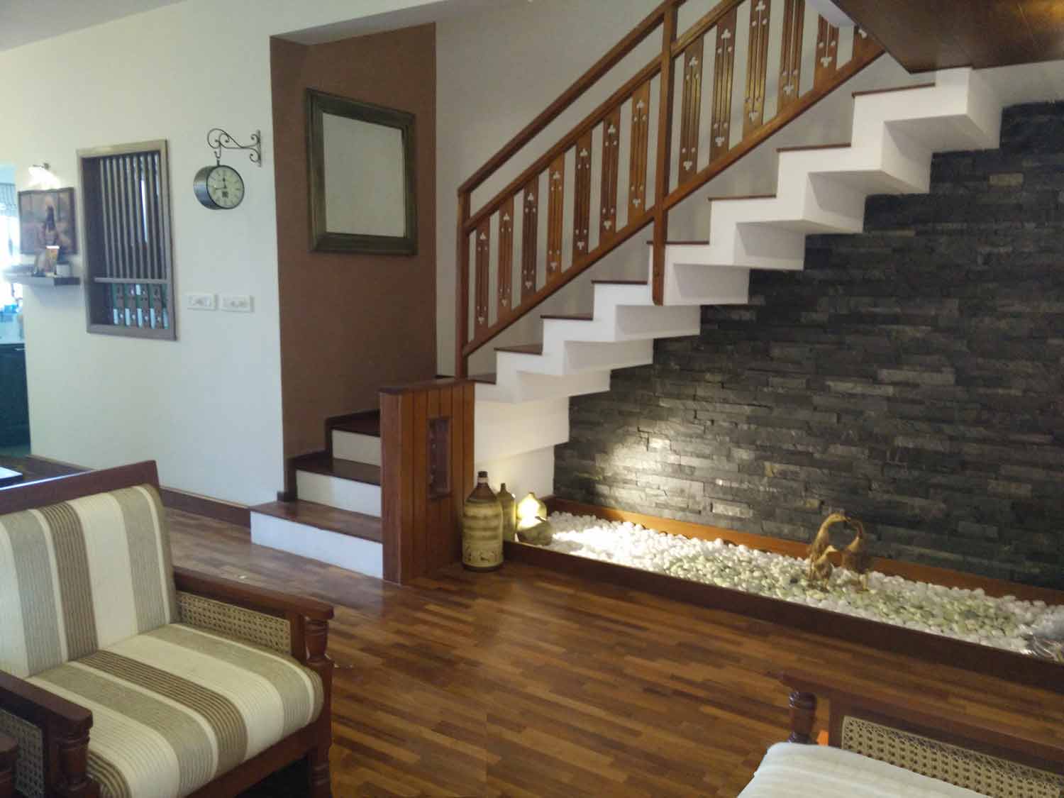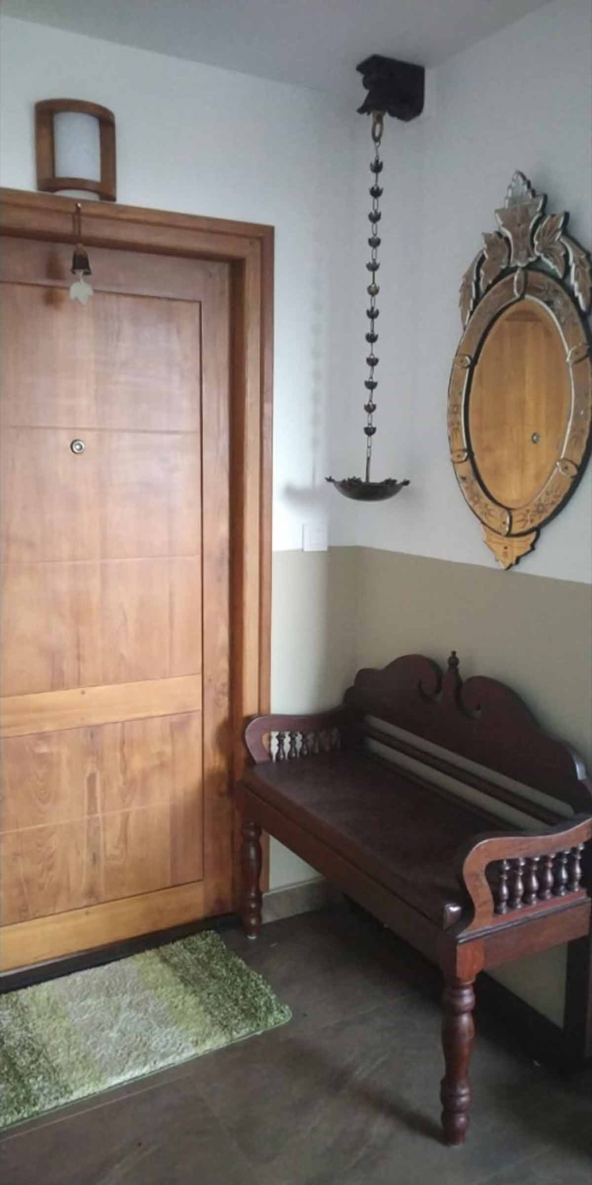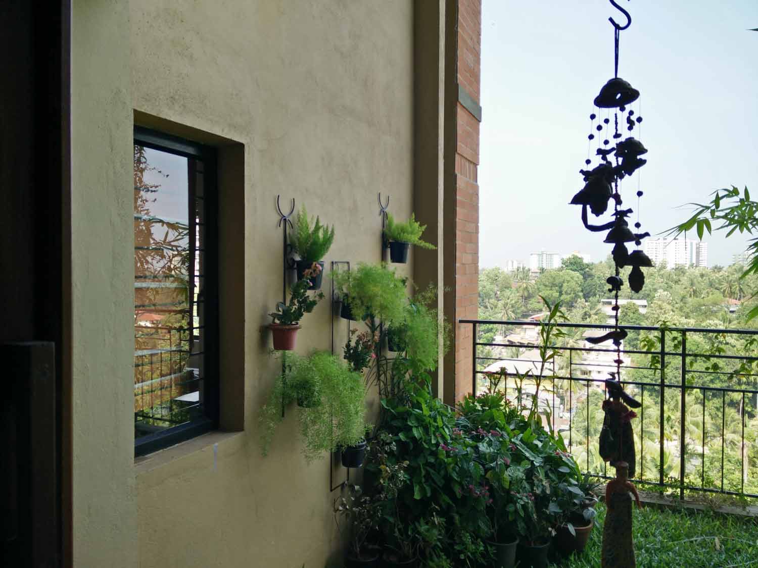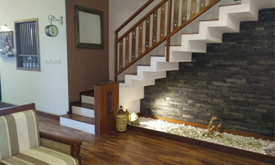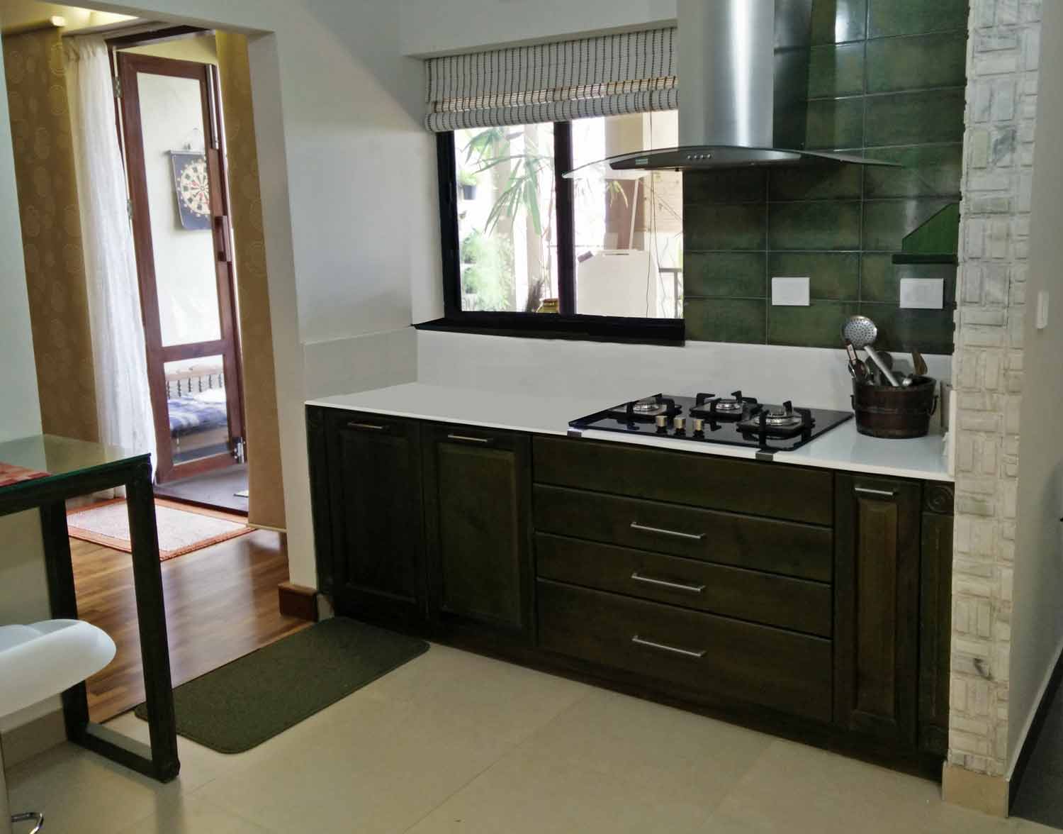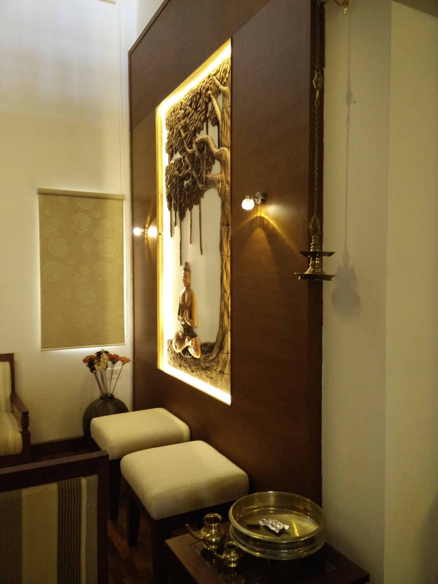 Fine finishes embellish the entire Duplex apartment for a Doctor and Dancer couple. A palette of traditional colours: green, orange, gentle beige and rich teak wood with terracotta was chosen. Deeply conscious of the Bodhi principle, the enlightenment of Buddha has been captured in terracotta and serves as one of the focal points of the design. Fabrics for the drapes, furniture and accessories selected were all textured, including luxurious blinds, smooth cotton and delicate silks. The Kitchen in green takes one’s breath away. The furniture except for the recliners has been locally crafted and provides an earthy feel.
