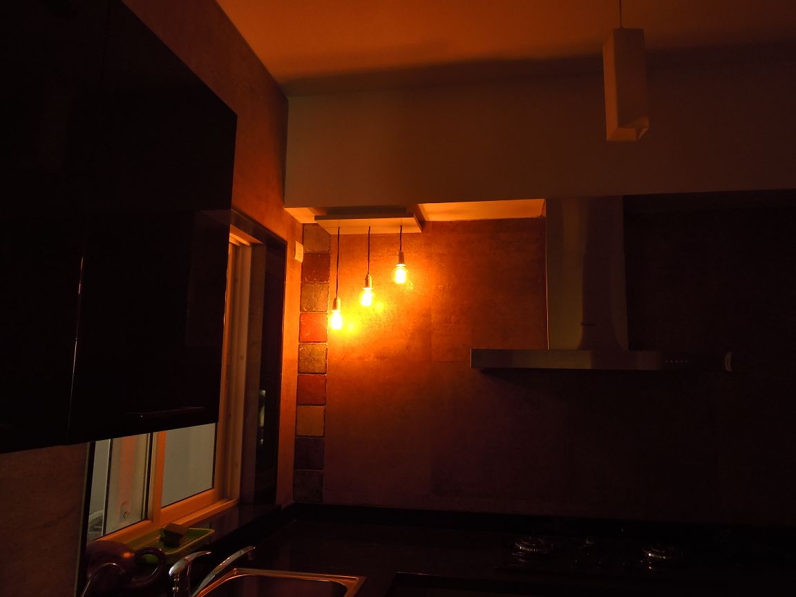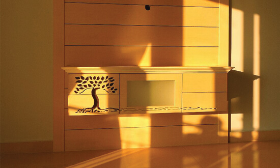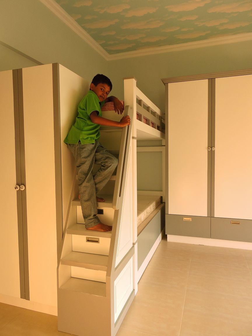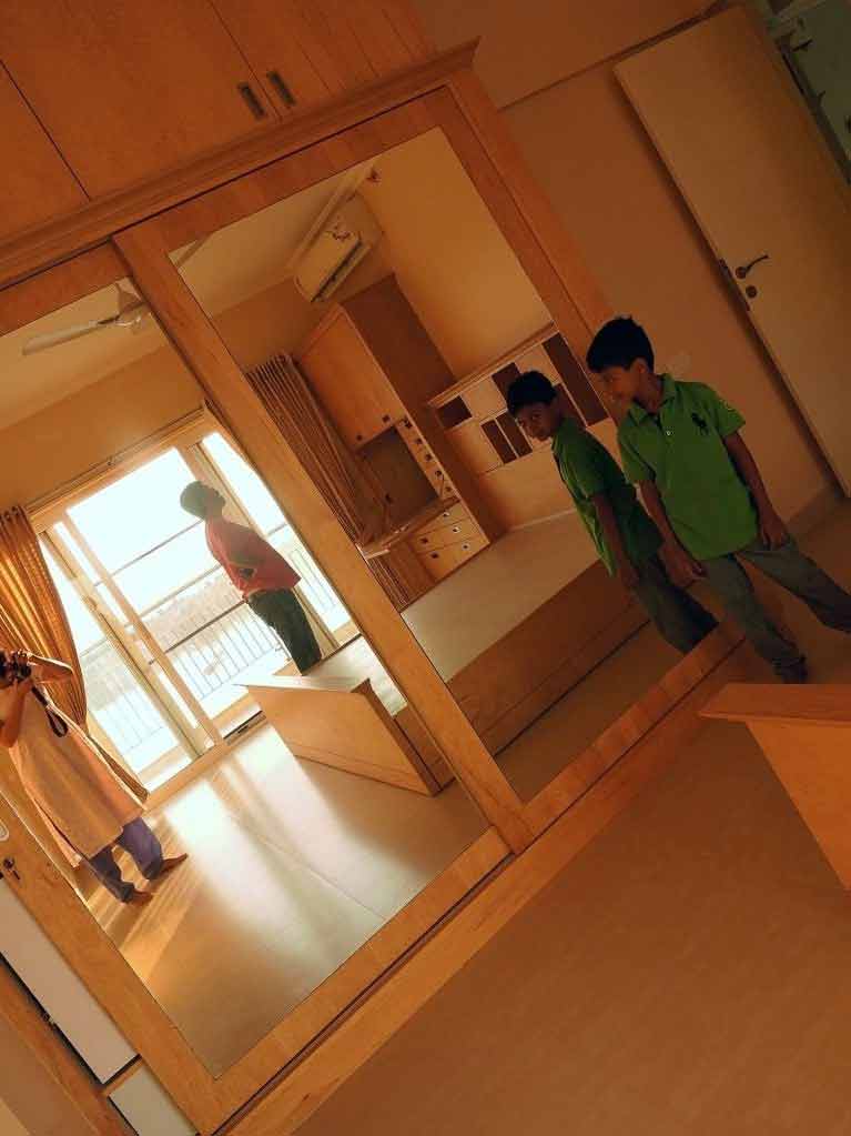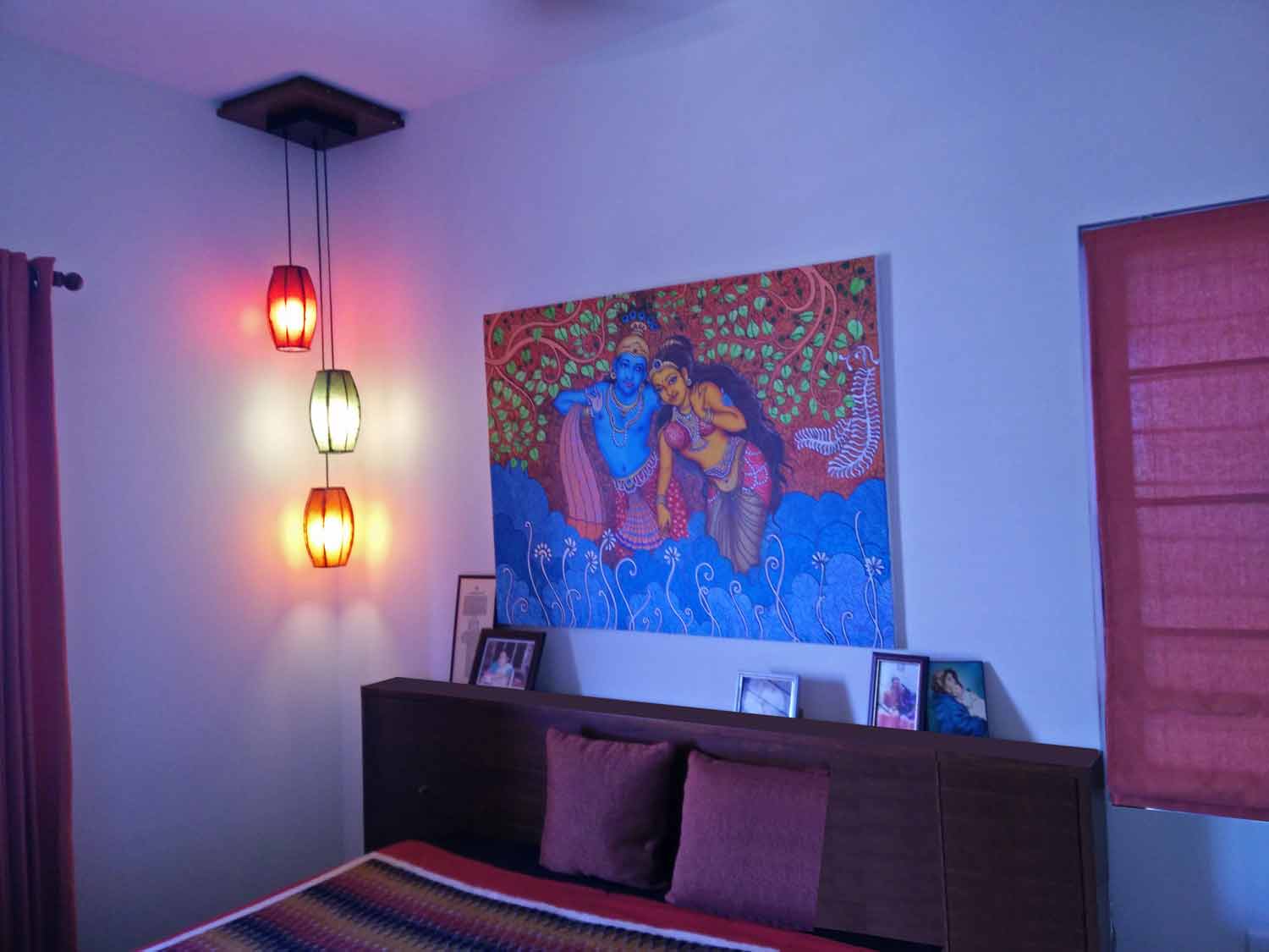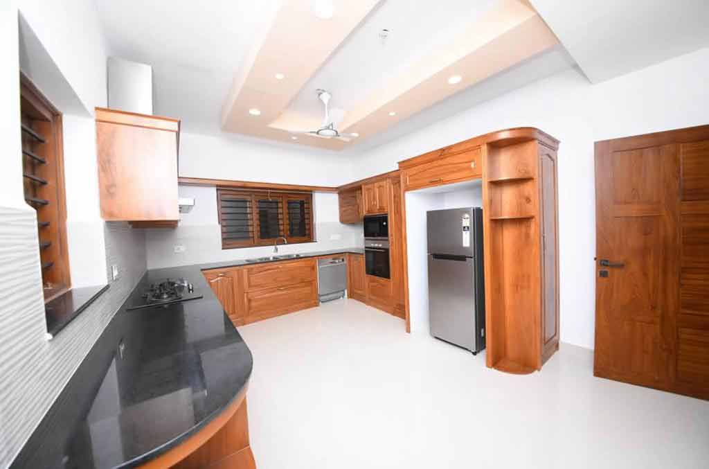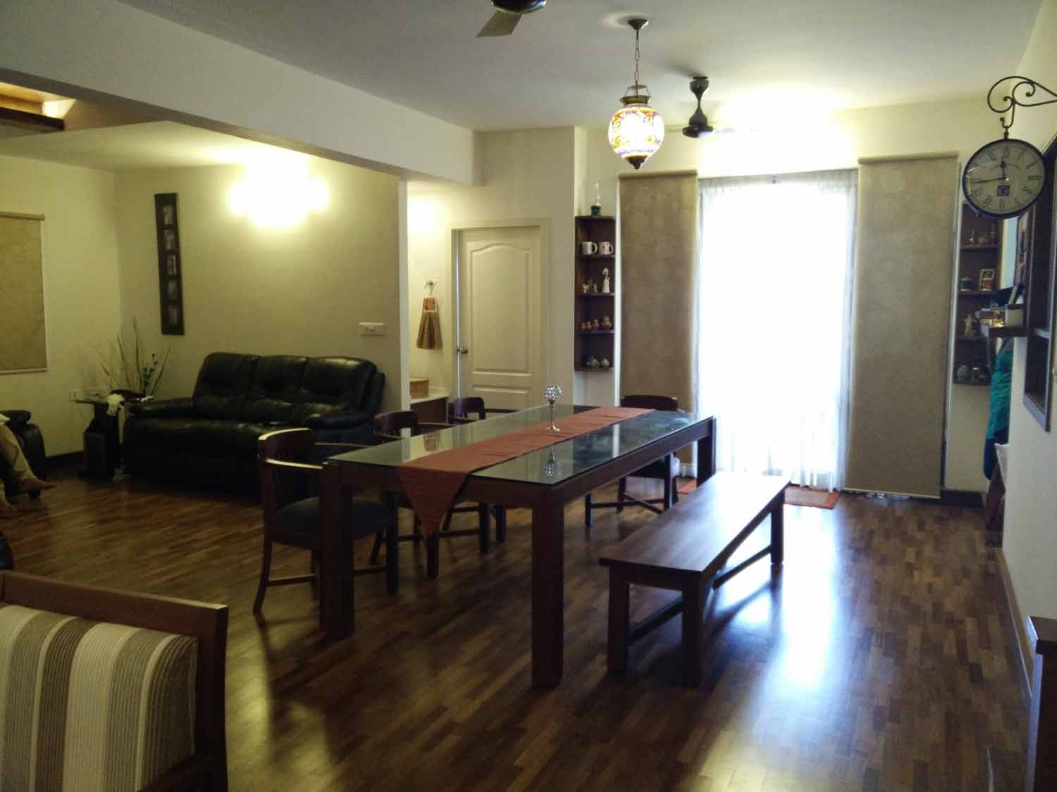 Fine finishes embellish the entire Duplex apartment for a Doctor and Dancer couple. A palette of traditional colours: green, orange, gentle beige and rich teak wood with terracotta was chosen. Deeply conscious of the Bodhi principle, the enlightenment of Buddha has been captured in terracotta and serves as one of the focal points of the design. Fabrics for the drapes, furniture and accessories selected were all textured, including luxurious blinds, smooth cotton and delicate silks. The Kitchen in green takes one’s breath away. The furniture except for the recliners has been locally crafted and provides an earthy feel.